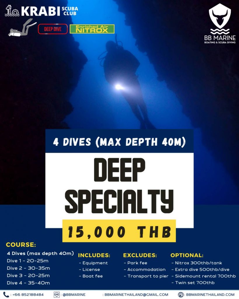 Deep Specialty is a scuba diving course designed to give divers the knowledge and skills needed to dive deeper than the usual recreational limit of 18 meters, reaching a maximum depth of 40 meters (must hold an Advanced Open Water certification). First of all, this course is not only about taking you down to depth, but also about teaching you how to carefully plan your dives, use dive computers and other equipment effectively, and manage the effects of increased pressure underwater.
